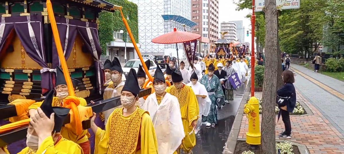 今年は3年ぶりに「北海道神宮祭」が行われ、タイミングよくファクトリー横の北1条通りで神輿山車などの練り歩きを見ることができました。